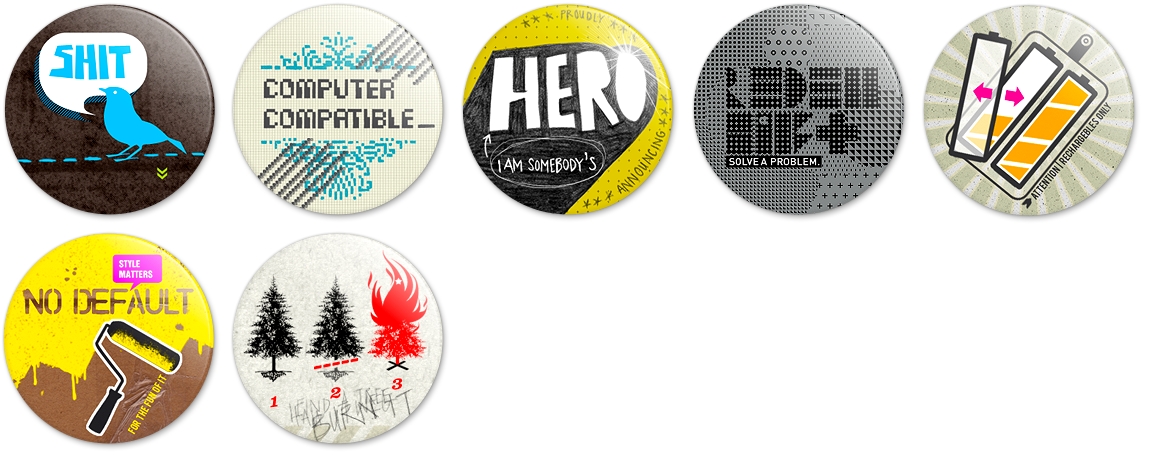Custom buttons for your individual wear, 25mm with needle. You can buy them at Prickie, the one with the burning tree was contributed to BATTERIEnext_17 and is available at ladestation.net.